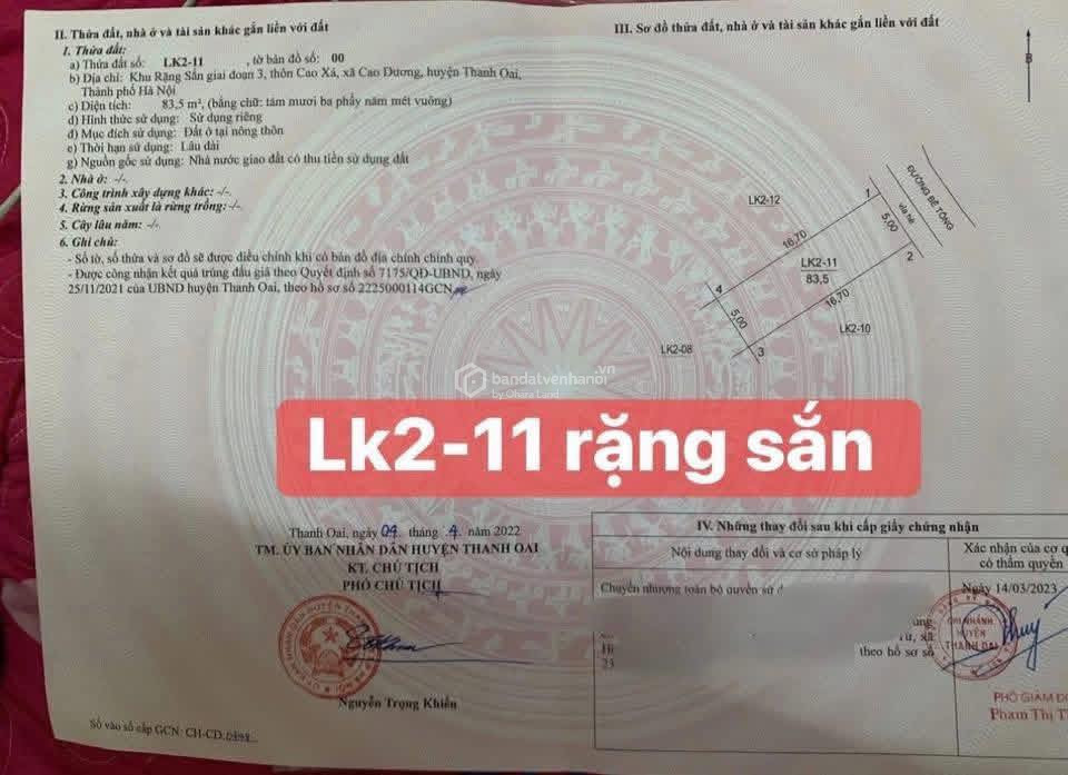 Bán đất đấu giá Rặng Sắn Cao Dương Thanh Oai LK02-11 83,5m2 đường 11m giá 6xtr/m2